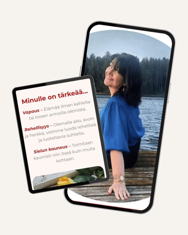 ”Haluan olla sinulle se luotettava henkilö, joka kulkee rinnallasi tässä muutoksessa ja itkee ja nauraa kanssasi. Henkilö, joka tuo sinulle ulkopuolista ja puolueetonta näkemystä, joka pohjautuu rehellisyyteen ja hyväksyntään. Elämä on opettanut minulle paljon armollisuutta niin itseäni ja muita kohtaan, joten voit luottaa siihen, että minä en arvostele.”